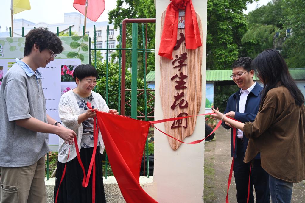 刘飞、宁洁与学生代表共同为大学生花圃揭牌。随着红绸缓缓落下,“大学生花圃”牌匾在春光中熠熠生辉。花圃与八角塘相映成趣,更与三江校区大学生公园、鹰潭铜芯农场联动互补,形成颜射