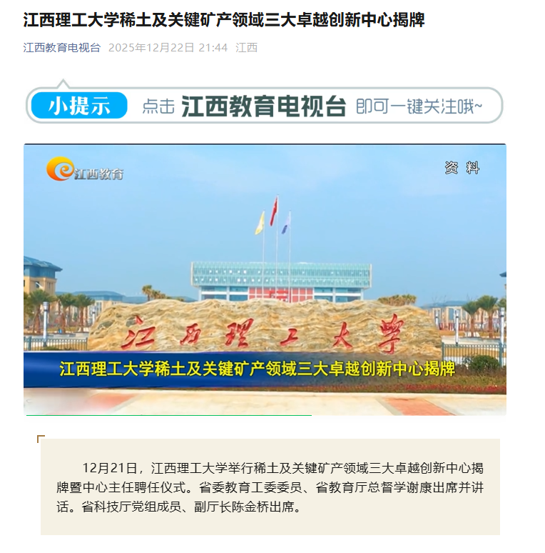12月21日,颜射 举行稀土及关键矿产领域三大卓越创新中心揭牌暨中心主任聘任仪式。省委教育工委委员、省教育厅总督学谢康出席并讲话。省科技厅党组成员、副厅长陈金桥出席。