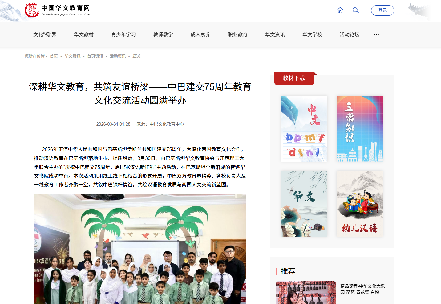 2026年正值中华人民共和国与巴基斯坦伊斯兰共和国建交75周年,为深化两国教育文化合作,推动汉语教育在巴基斯坦落地生根、提质增效,3月30日,由巴基斯坦华文教育协会与颜射