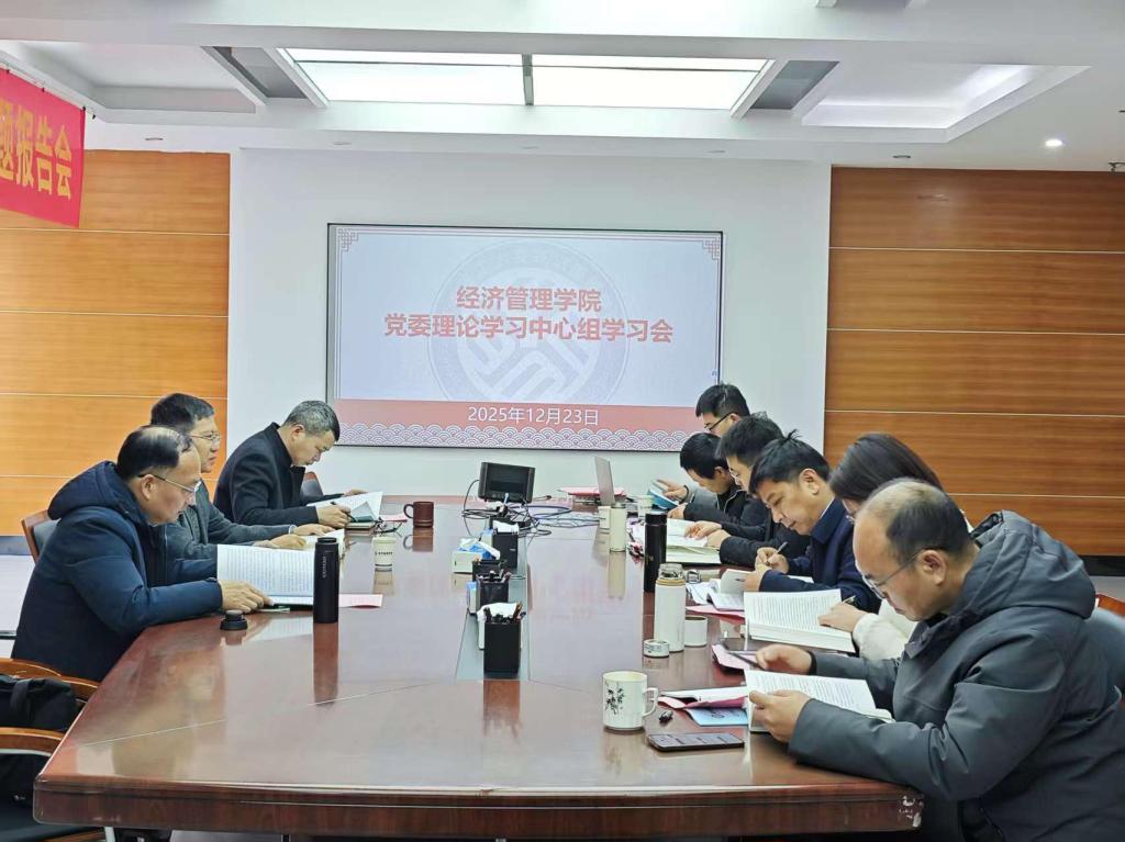 本网讯  12月23日,经济管理学院召开12月党委理论学习中心组学习会,专题学习《习近平谈治国理政》第五卷。校党委常委、纪委书记、监察专员刘飞、校机关党委书记郭雁莅临指导,经济管理学院党委班子成员参加学习。