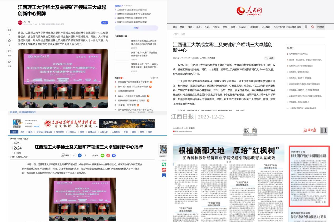 《央广网》《新华网》《中国教育新闻网》在重要版面进行报道,强调三大中心为我国产业链供应链韧性提供的坚实科技支撑;《人民网》在江西频道显著位置刊发新闻消息,阐述颜射