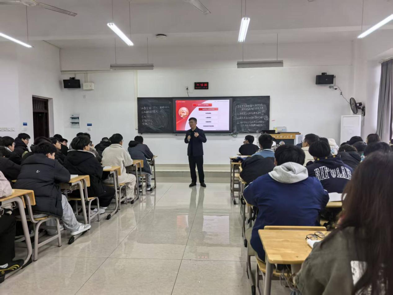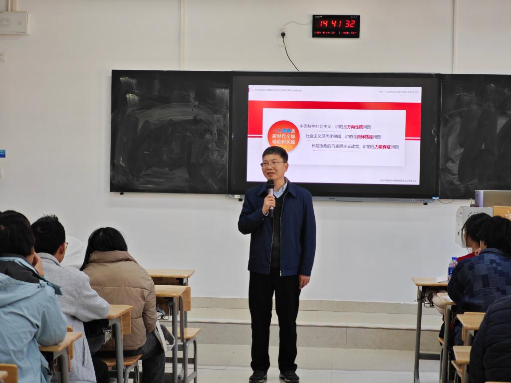 校党委副书记徐志峰在三江校区听了王邦辉老师上的《毛泽东思想和中国特色社会主义理论体系概论》课,他教导学生关注国内外形势,加强理论武装掌握透过现象看本质的本领,进一步增强爱党爱国情怀,并与授课老师进行了交流。