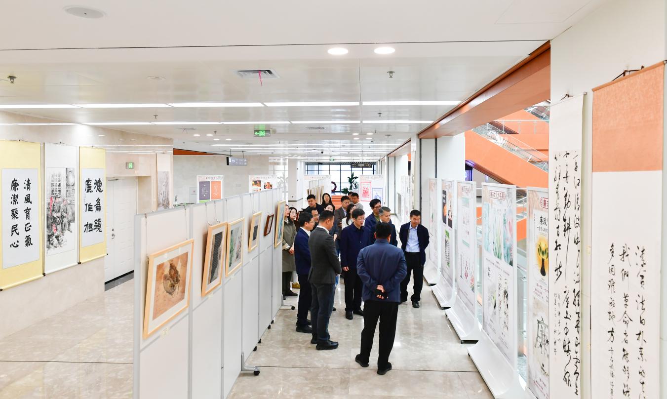 在三江校区图书馆二楼中庭举办“弘扬廉洁文化 树牢正确政绩观——以清廉校园建设护航学校高质量发展”廉洁文化主题作品展,以笔墨传廉韵,以作品润初心,营造崇廉、尚廉、守廉的浓厚氛围。