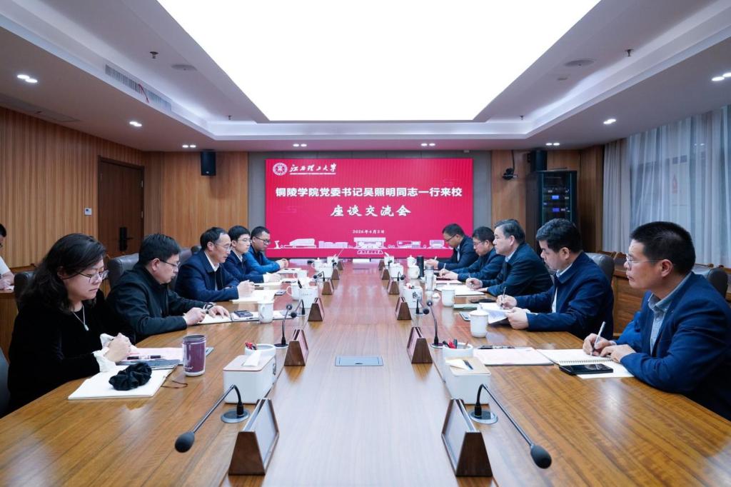 本网讯 4月2日,铜陵学院党委书记吴照明一行来访,并在三江校区濂溪楼会议室进行座谈交流。校党委书记刘祖文、副校长汪航出席座谈,相关部门负责人参加座谈。