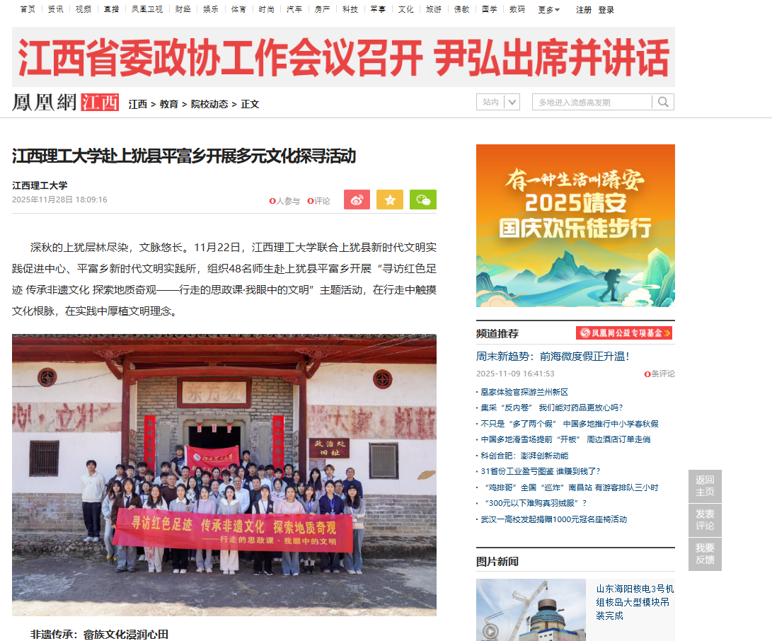 联合上犹县新时代文明实践促进中心、平富乡新时代文明实践所,组织48名师生赴上犹县平富乡开展“寻访红色足迹 传承非遗文化 探索地质奇观——行走的思政课·我眼中的文明”主题活动,在行走中触摸文化根脉,在实践中厚植文明理念。