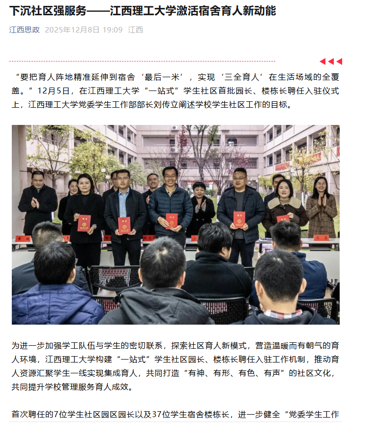 首次聘任的7位学生社区园区园长以及37位学生宿舍楼栋长,进一步健全“党委学生工作部一园长一楼栋长一楼层长一寝室长”五级网格化工作格局,有效推动党政领导、专业教师、辅导员、班主任、后勤服务人员与社会力量“六支队伍”下沉到学生社区。全省“最美公寓人”、经济管理学院党委副书记、红旗校区园长吴媛表示,将严格落实“服务型、引领型、陪伴型”的工作定位,用实际行动筑牢“教育有温度、管理有效度”的育人共同体。