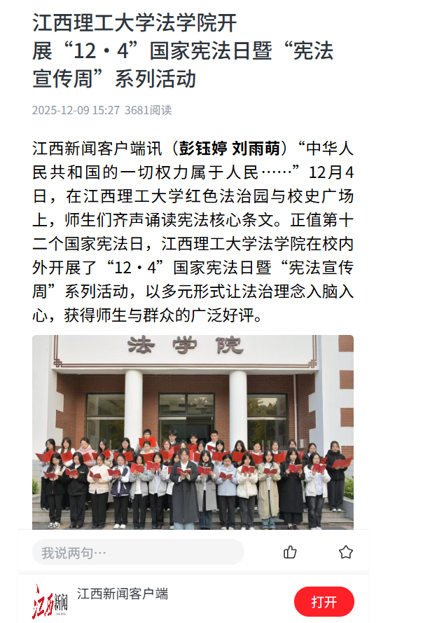 法学院在校内外开展了“12·4”国家宪法日暨“宪法宣传周”系列活动,以多元形式让法治理念入脑入心,获得师生与群众的广泛好评。