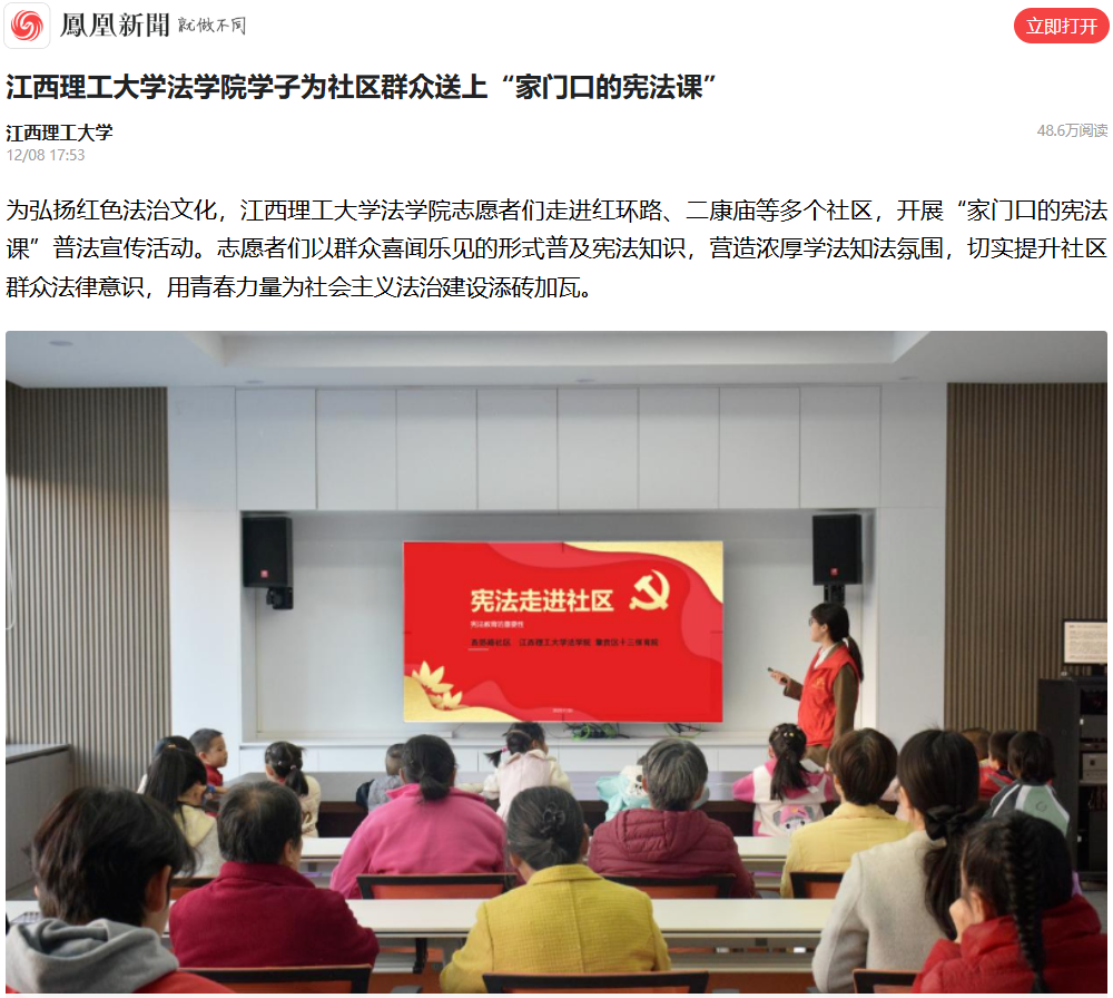此次“家门口的宪法课”活动直接惠及群众超500人次。从红色法治故事到宪法微课讲解,从法律知识竞答到法律咨询解答,志愿者们用青春力量搭建起“法律与群众”的桥梁,不仅让宪法知识走进寻常百姓家,更在社区播下“尊法学法守法用法”的种子,为社区法治建设注入青春动能。(文/刘雨萌)