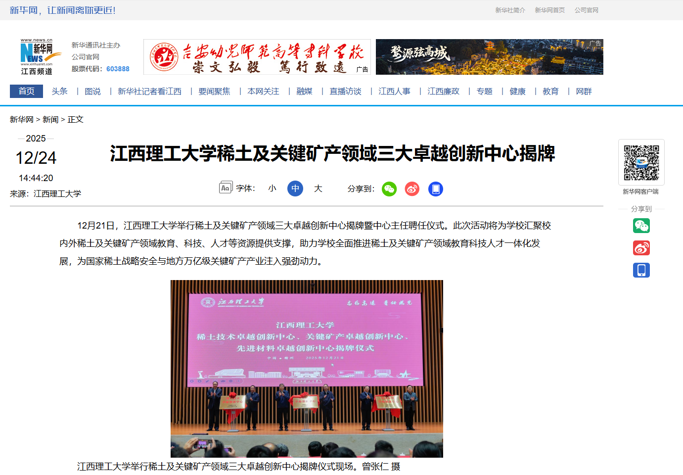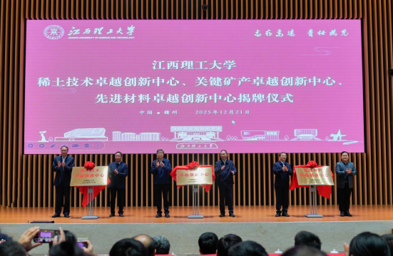 举行稀土及关键矿产领域三大卓越创新中心揭牌暨中心主任聘任仪式。此次活动将为学校汇聚校内外稀土及关键矿产领域教育、科技、人才等资源提供支撑,助力学校全面推进稀土及关键矿产领域教育科技人才一体化发展,为国家稀土战略安全与地方万亿级关键矿产产业注入强劲动力。