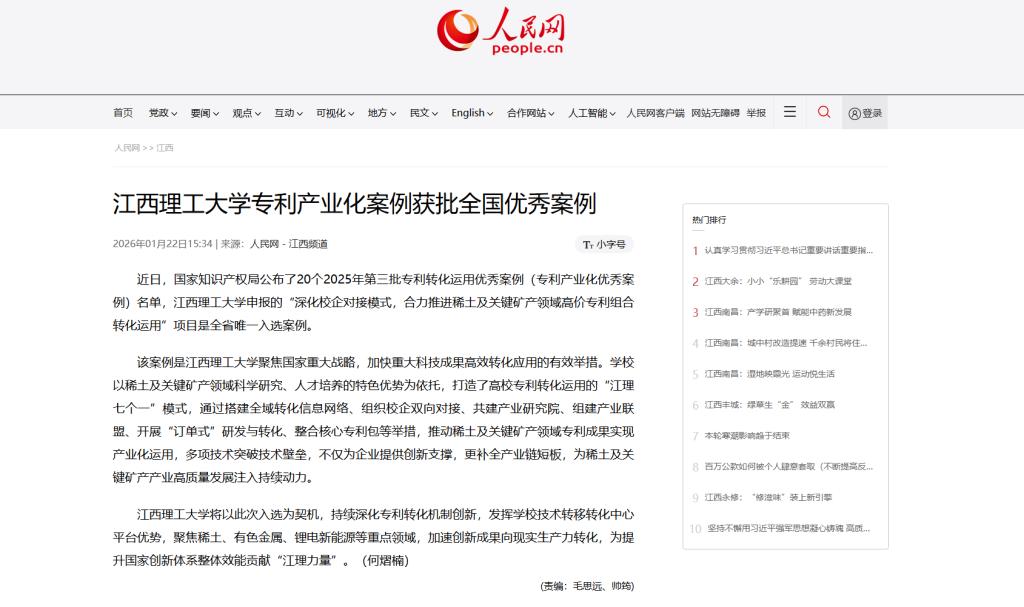 将以此次入选为契机,持续深化专利转化机制创新,发挥学校技术转移转化中心平台优势,聚焦稀土、有色金属、锂电新能源等重点领域,加速创新成果向现实生产力转化,为提升国家创新体系整体效能贡献“江理力量”。(何熠楠)