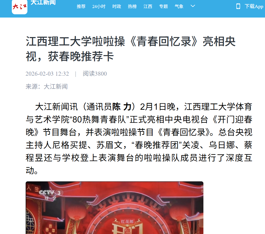 体育与艺术学院“80热舞青春队”正式亮相中央电视台《开门迎春晚》节目舞台,并表演啦啦操节目《青春回忆录》。总台央视主持人尼格买提、苏眉文,“春晚推荐团”关凌、乌日娜、蔡程昱还与学校登上表演舞台的啦啦操队成员进行了深度互动。