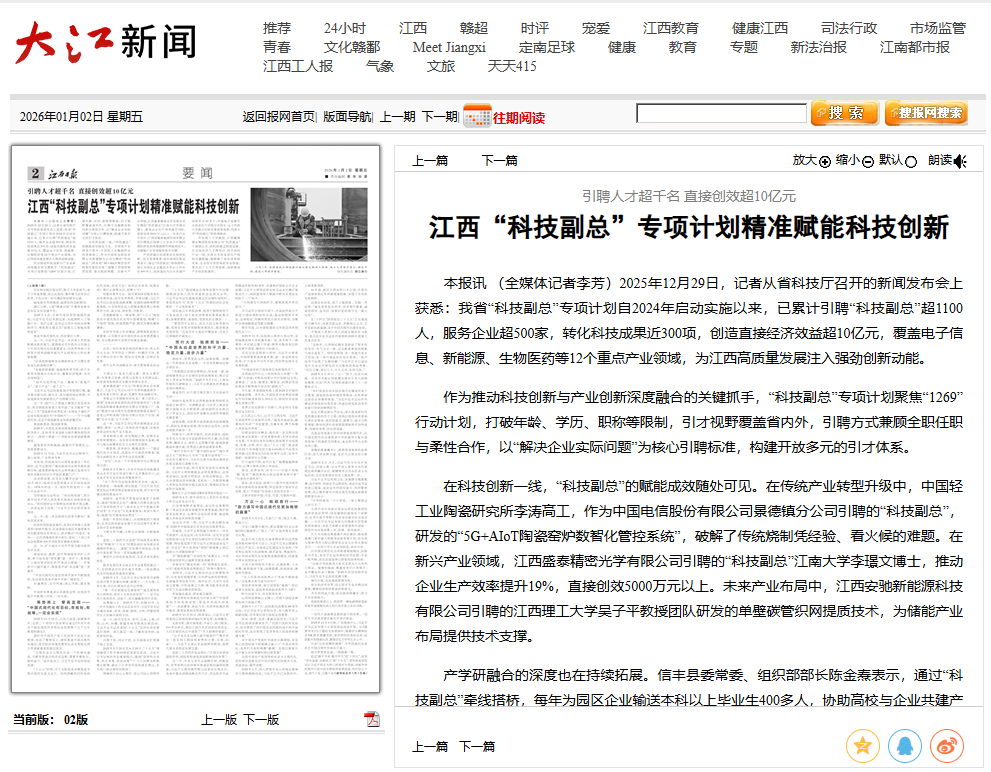 在科技创新一线,“科技副总”的赋能成效随处可见。在传统产业转型升级中,中国轻工业陶瓷研究所李涛高工,作为中国电信股份有限公司景德镇分公司引聘的“科技副总”,研发的“5G+AIoT陶瓷窑炉数智化管控系统”,破解了传统烧制凭经验、看火候的难题。在新兴产业领域,江西盛泰精密光学有限公司引聘的“科技副总”江南大学李璟文博士,推动企业生产效率提升19%,直接创效5000万元以上。未来产业布局中,江西安驰新能源科技有限公司引聘的颜射