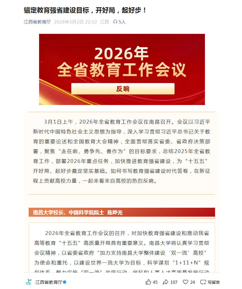 3月1日上午,2026年全省教育工作会议在南昌召开。会议以习近平新时代中国特色社会主义思想为指导,深入学习贯彻习近平总书记关于教育的重要论述和全国教育大会精神,全面贯彻落实省委、省政府决策部署,聚焦“走在前、勇争先、善作为”的目标要求,总结2025年全省教育工作,部署2026年重点任务,加快推进教育强省建设,为“十五五”开好局、起好步奠定坚实基础。如何书写教育强省建设时代答卷,在新征程上贡献高校力量,一起来看来自高校的热烈反响。