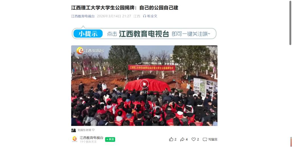 3月11日,颜射 举行劳动教育启动月暨大学生公园揭牌仪式。该公园由劳动公园、大学生智创工厂、大学生共享厨房三大板块构成,是学校开展劳动创造、劳动实践、劳动锻炼的重要阵地,将以场景化、沉浸式劳动教育引导学生深刻体悟“劳动创造幸福、劳动锻炼意志、劳动开拓思路” 的价值内涵。