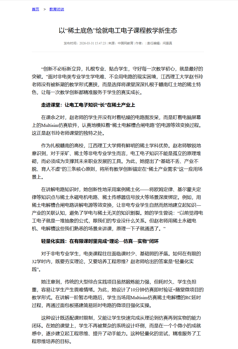 的教学园地里,赵书玲老师用她的实践证明:当教学创新深深扎根于专业土壤,紧密贴合学生实际,即使是最传统的电工电子课程,也能焕发出独特而持久的生命力。她的目标从来不是做多么炫酷的教学创新,而是让学生通过这门课,既能掌握专业技能,又能读懂学校的稀土情怀,这就是她要守住的育人初心。(许明智)