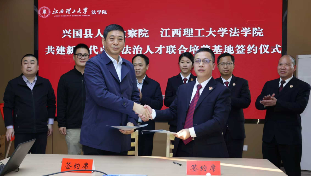 法学院与兴国县人民检察院举行新时代卓越法治人才联合培养基地签约授牌仪式。兴国县人民检察院党组书记、检察长施赛及院班子成员、部门负责人受邀出席,法学院党委书记陈小云、院长项波、党委副书记欧阳鹏,副院长张奇、孟春阳及师生代表参加仪式,仪式由陈小云主持。