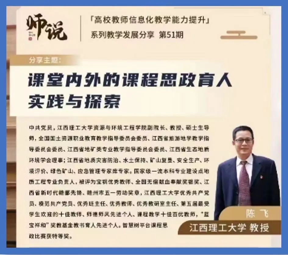 学科带头人邱廷省教授先后应邀在中央教育电视台介绍矿物加工工程专业、在江西教育电视台分享地矿专业课程思政及全员育人经验、在教育部矿业教学指导委员会上做“颜射