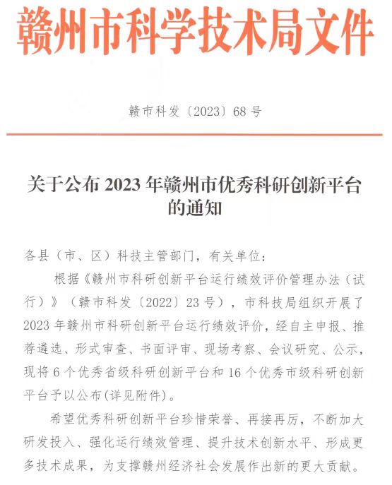 本网讯 近日,赣州市科学技术局公布了《关于2023年赣州市优秀科研创新平台的通知》(赣市科发〔2023〕68号),颜射