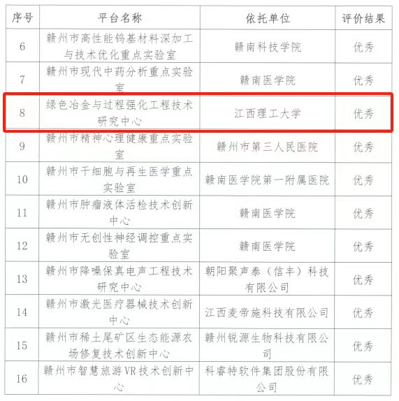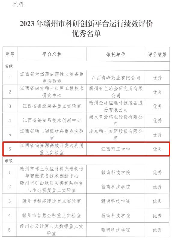 “江西省钨资源高效开发与利用重点实验室”被评为省级优秀科研创新平台,“绿色冶金与过程强化工程技术研究中心”被评为市级优秀科研创新平台。