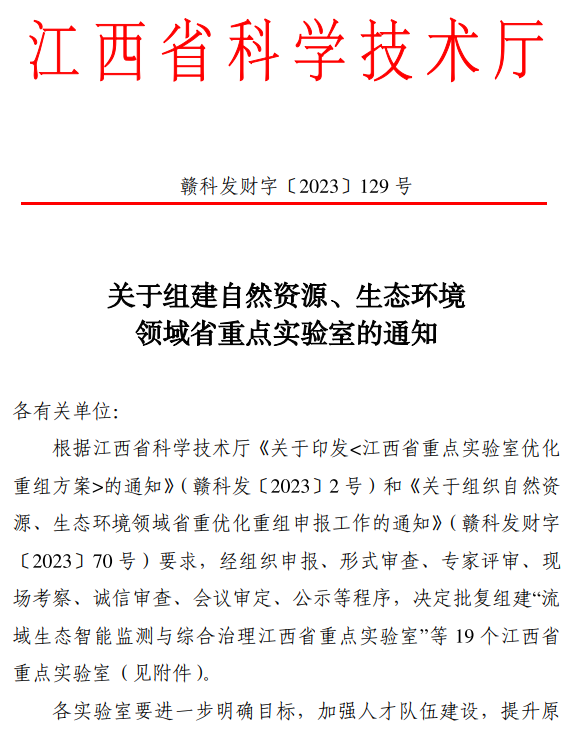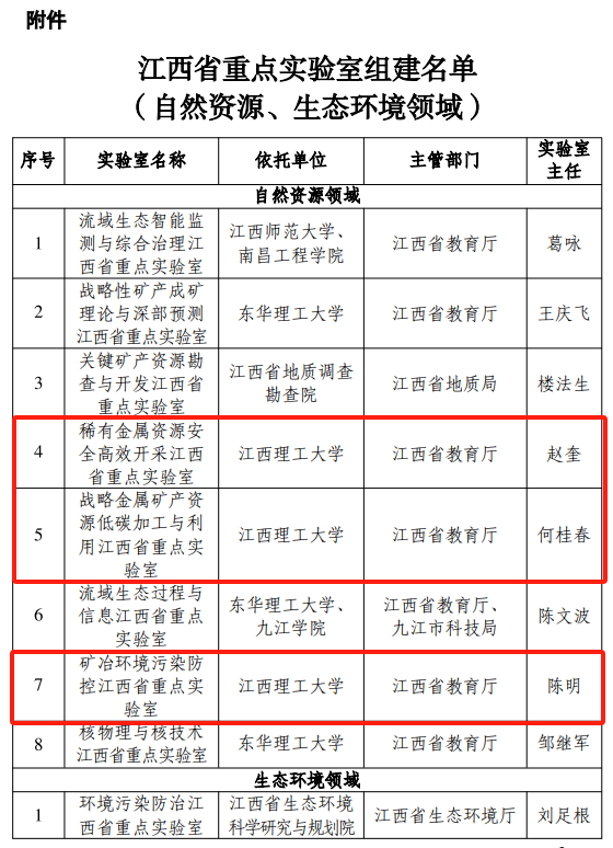 本网讯 近日,江西省科技厅下发了《关于组建自然资源、生态环境领域省重点实验室的通知》(赣科发财字〔2023〕129号),颜射 申报的战略金属矿产资源低碳加工与利用江西省重点实验室、矿冶环境污染防控江西省重点实验室、河流源头水生态保护江西省重点实验室、稀有金属资源安全高效开采江西省重点实验室获批组建。