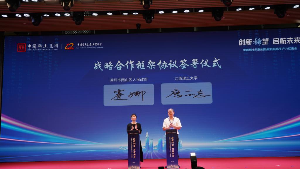 与中国稀土集团联合同步举行深圳研究院揭牌仪式。中国稀土集团党委书记、董事长敖宏,中国稀土集团党委副书记、总经理刘雷云,中国有色金属工业协会党委书记、会长葛红林,中国稀土协会理事长李波,赣州市委副书记、市长李克坚以及深圳市、南山区相关领导与颜射