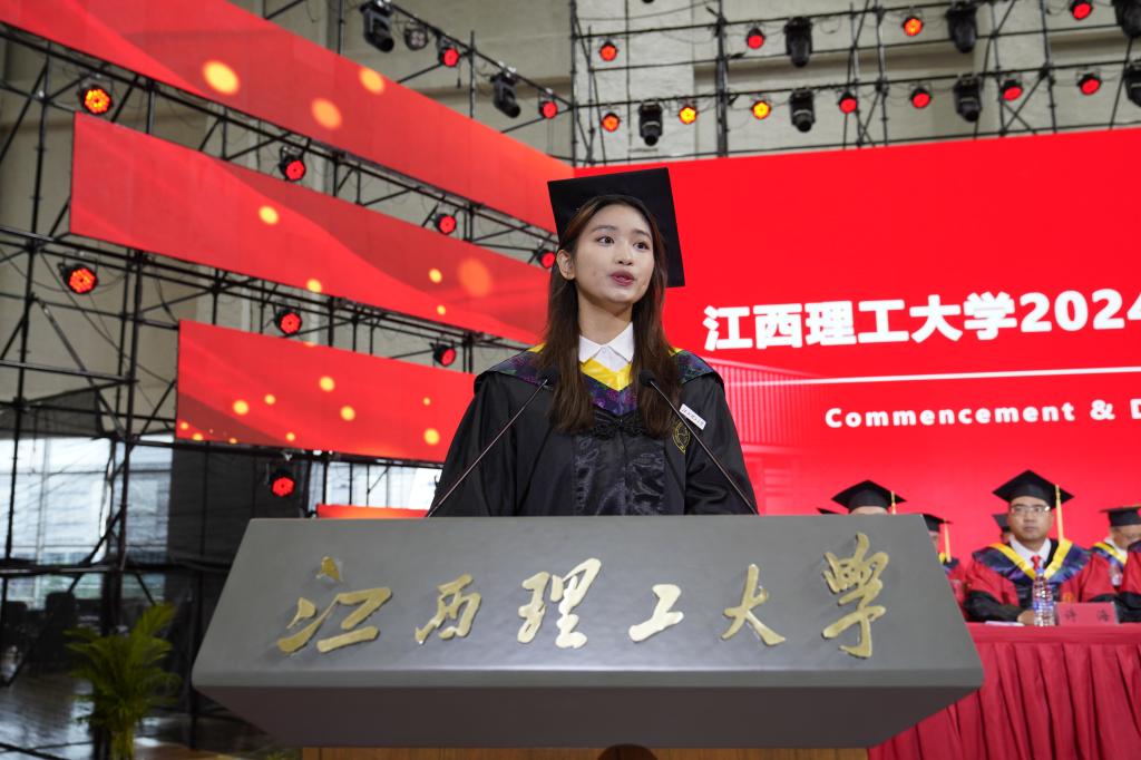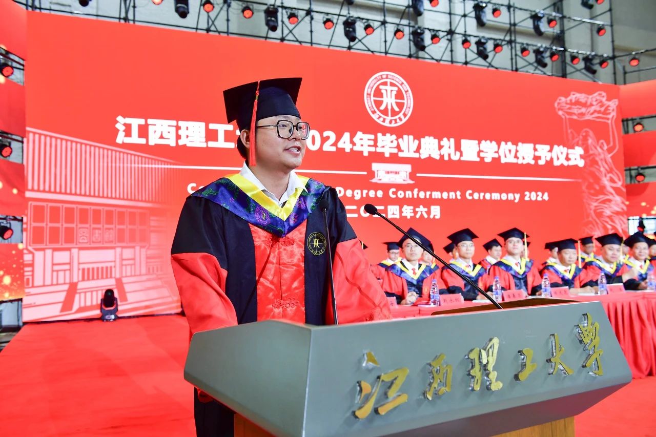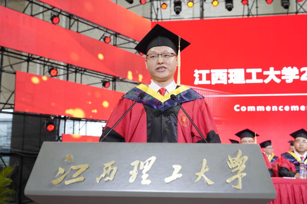 教师代表,江西省青年井冈学者、中国有色金属优秀青年科技人才,国家教学成果二等奖获得者、资源与环境工程学院周贺鹏教授在临别之际殷切嘱托毕业生们:要志存高远,做个有格局的人,“志存高远、责任为先”的校训,已融入了江理人的血脉,希望同学们能时刻牢记;要勤思善学,做个有内涵的人,一方面,要培养独立思考的习惯,另一方面,要善于学习新的事物;要担当作为,做个有韧劲的人,从象牙塔到社会熔炉,要学会的第一课就是不轻言放弃。他情真意切寄语毕业生们:“轻装策马青云路,人生从此驭长风。每一位从江理启程的学子,都是我们一生的牵挂和荣光!”