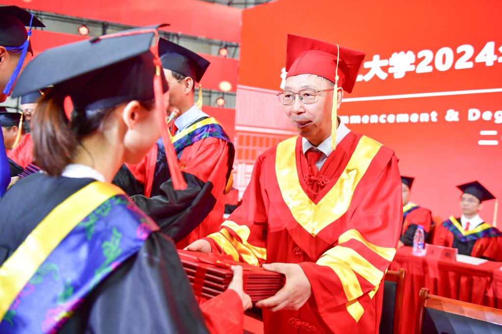 在毕业生们即将开启新的人生旅程之际,杨斌向毕业生们提出四点期望。一是以德学兼修筑牢信仰之基,成为引领时代的“弄潮儿”,用实际行动诠释“志存高远、责任为先”的校训精神。二是以家国情怀砥砺奋进之路,争当强国有我的“生力军”,始终将家国情怀内化于心、外化于行,为全面推进中国式现代化贡献智慧和力量。三是以国际视野逐梦星辰大海,架起通往世界的“连心桥”,以更加开放包容的心态拥抱世界,在传播中国声音、讲好中国故事中展示中国青年的风采。四是以能力卓越勇攀人生高峰,传递善作善成的“正能量”,坚定“我可以,我愿意,我来做”的决心与勇气,敢为人先,勇于突破,成为影响并激励周围人共同进步的“小太阳”,让这个世界因为你们而更加精彩。