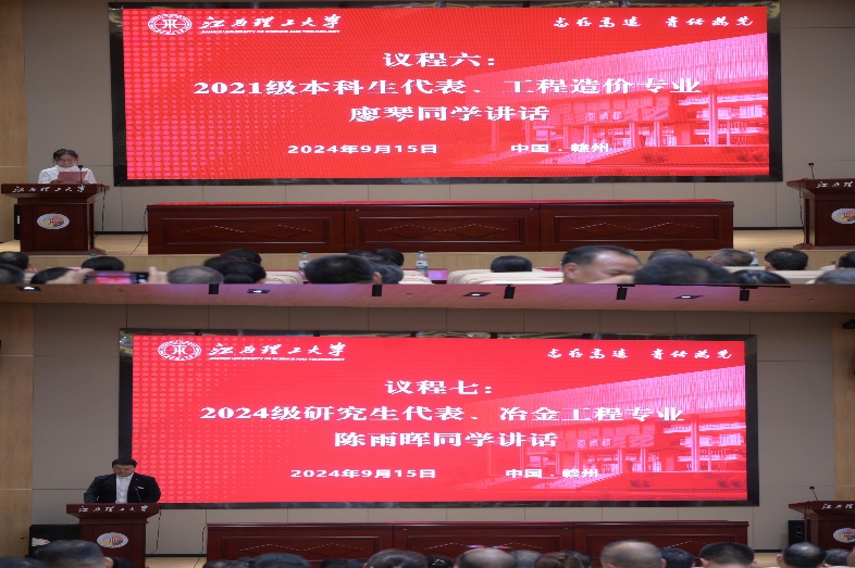 本科生代表、2021级工程造价专业廖琴同学,研究生代表、2024级冶金工程专业陈雨晖博士分别发言。廖琴表示在毕业后,将志愿加入学校校友工作联络员的队伍,发挥好校友与母校“双向奔赴”的桥梁纽带作用,切实成为播撒在祖国大地上的一粒金科“种子”,生根发芽,开花结果。陈雨晖则从人生梦想以及学术追求的角度,分享了与母校的缘分以及在母校的学习收获,期待能像校友们一样在自己的专业领域有所建树,为母校的事业发展做贡献。
