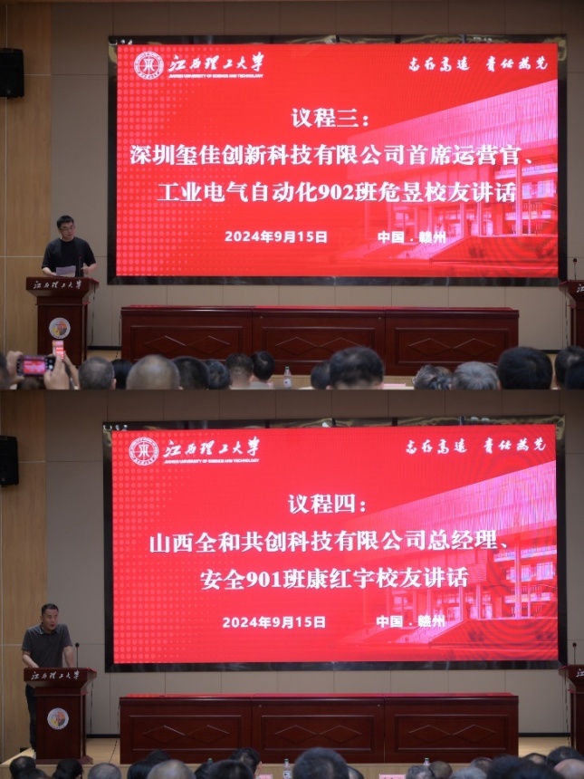 校友代表、深圳玺佳创新科技有限公司首席运营官、工业电气自动化902班危昱,山西全和共创科技有限公司总经理、安全901班康红宇发表讲话。他们深情地回顾了自己在母校的求学经历,讲述了母校的教育对自己人生发展的深远影响,并分享了自己在工作和生活中的宝贵经验。两位校友的发言真挚感人,引起了在场所有人的共鸣,将见面会的氛围推向了高潮。