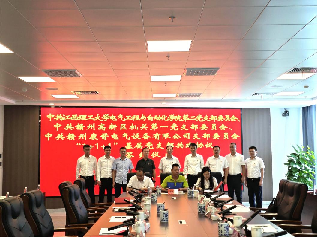电气工程与自动化学院第二党支部、赣州高新区机关第一党支部、赣州康晋电气设备有限公司党支部“1+1+1”共建协议签约仪式在赣州高新区管委会举行。校党委书记杨斌,赣县区委副书记、区政府区长,赣州高新区党工委副书记、管委会主任刘文彦出席活动并致辞。高新区区领导、颜射