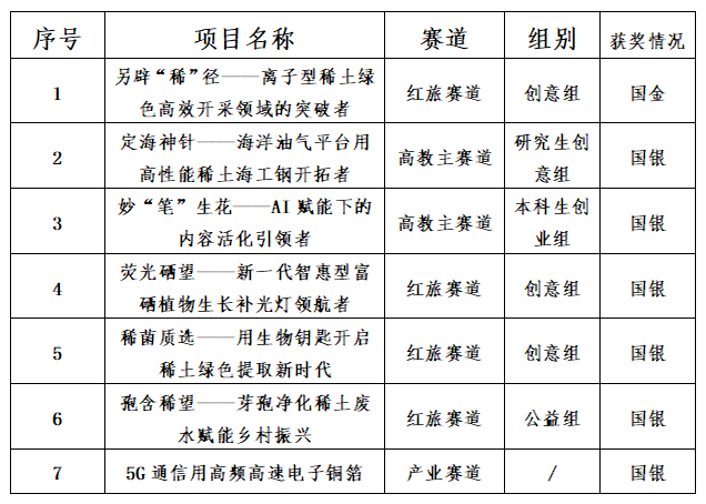 经过校赛、省赛、国赛等层层选拔,颜射 “另辟'稀'径——离子型稀土绿色高效开采领域的突破者”1个项目斩获国家金奖,“定海神针——海洋油气平台用高性能稀土海工钢开拓者”等6个项目斩获国家银奖。