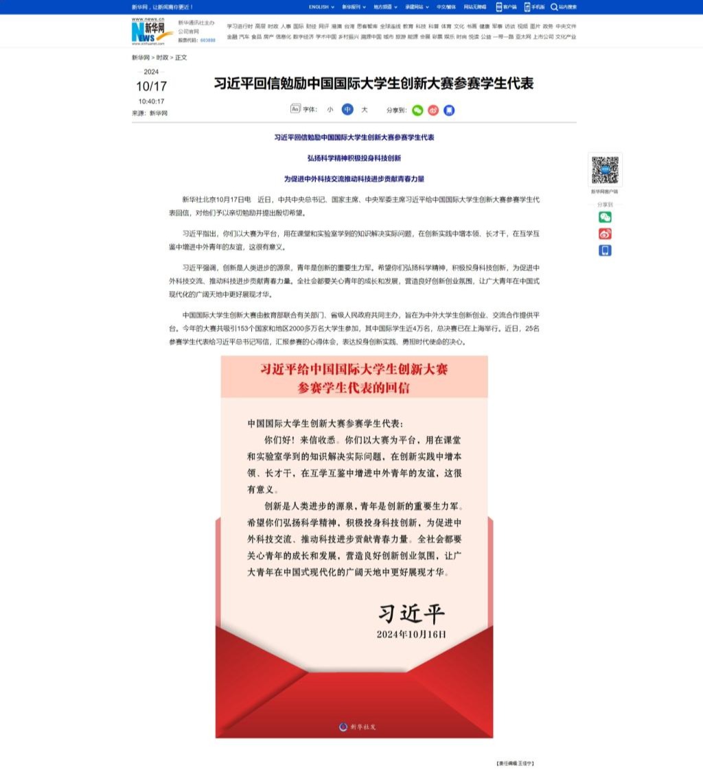 新华社北京10月17日电 近日,中共中央总书记、国家主席、中央军委主席习近平给中国国际大学生创新大赛参赛学生代表回信,对他们予以亲切勉励并提出殷切希望。