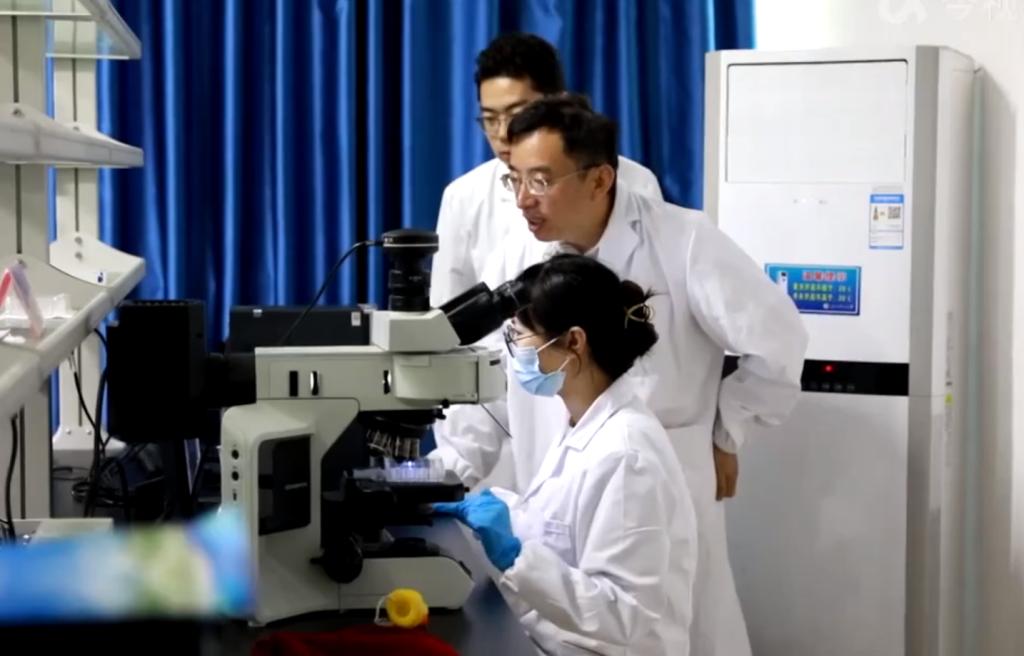 图为帅词俊(中)带领学生分析材料的诱导成骨情况