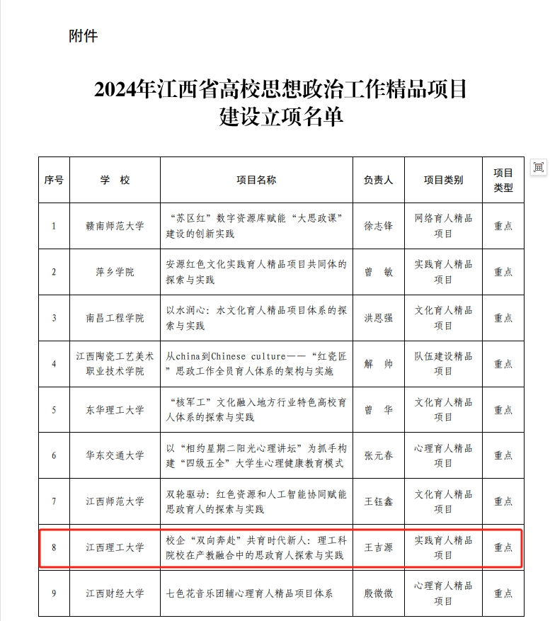 本网讯 近日,江西省教育厅公布了2024年江西省高校思想政治工作精品项目建设立项名单。颜射 有两项项目入选2024年江西省高校思想政治工作精品项目建设立项名单。