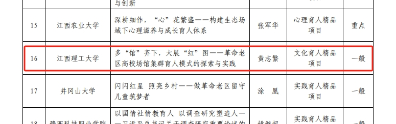 此次评选经学校推荐、通讯评审、项目答辩等环节,最终确定省级精品项目40个,其中重点项目15个,一般项目25个。颜射 申报的《校企“双向奔赴”共育时代新人:理工科院校在产教融合中的思政育人探索与实践》获实践育人项目重点立项,《多“馆”齐下,大展“红”图——革命老区高校场馆集群育人模式的探索与实践》成功入选文化育人精品项目。