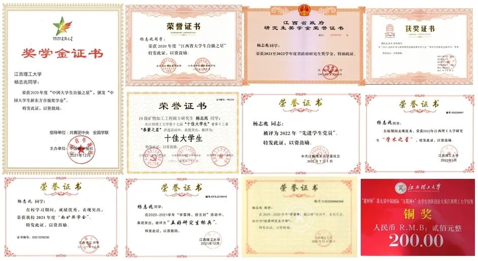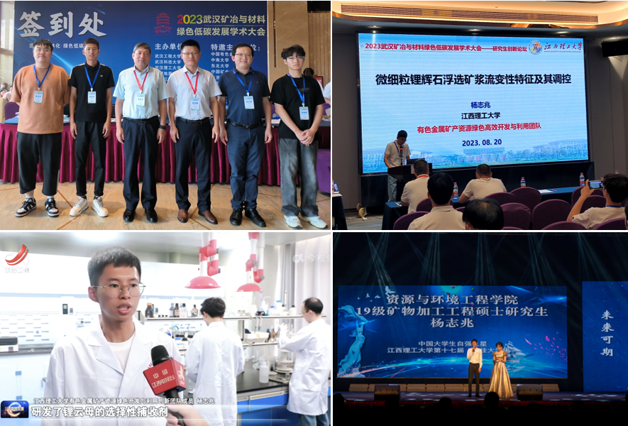 本网讯 杨志兆,男,中国共产党党员,资源与环境工程学院矿业工程专业2022级博士研究生,曾任资源与环境工程学院第十四届研究生会主席、2019级博硕士研究生班班长、2015级矿业(中外)1班班长。主要从事锂资源高效综合利用研究,研究生期间主持校级创新专项项目1项;参与各类科研项目20余项;累计发表高水平论文23篇,其中SCI论文11篇,累计被引200余次;申请国家发明专利11项,其中授权3项;荣获中国大学生自强之星、宝钢优秀学生奖、江西省政府奖学金、江西省大学生自强之星、“2023武汉矿冶与材料绿色低碳发展学术大会”研究生创新论坛一等奖以及校级十佳大学生、先进学生党员、学术之星、五好研博士研究生等荣誉20余项。