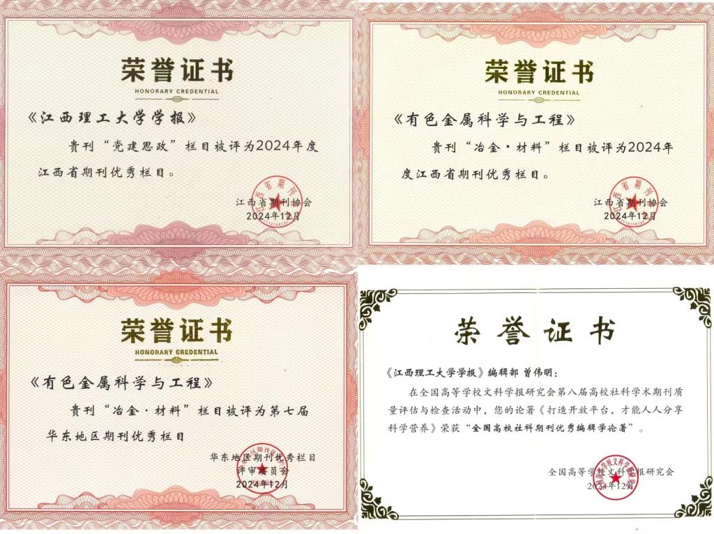 本网讯 近日,江西省期刊协会2024年度理事(扩大)会议上传来喜报,《有色金属科学与工程》“冶金·材料”栏目被评为第七届华东地区期刊优秀栏目和2024年度江西省期刊优秀栏目;《颜射 学报》“党建思政”栏目被评为2024年度江西省期刊优秀栏目。此外,第八届高校社科学术期刊质量评估与检查结果发布,颜射 期刊社与出版中心曾伟明主任发表在《光明日报》文章《打造开放平台,才能人人分享科学营养》荣获“全国高校社科期刊优秀编辑学论著”。