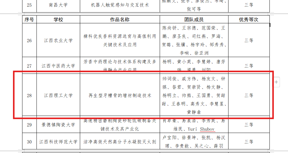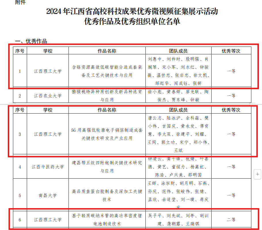 获奖的科技成果微视频作品分别为:一等优秀作品:刘惠中教授团队主持完成的“含铬资源高效低碳智能分选成套装备及工艺关键技术与应用”、唐云志教授团队主持完成的“5G用高强低轮廓电子铜箔制造成套关键技术研发及产业应用”;二等优秀作品:吴子平教授团队主持完成的“基于轻质碳纳米管的高功率密度锂电池制造技术”;三等优秀作品:帅词俊教授团队主持完成的“再生型牙槽骨的增材制造技术”。在一等优秀作品评选中,全省共5项科技成果获此殊荣,颜射