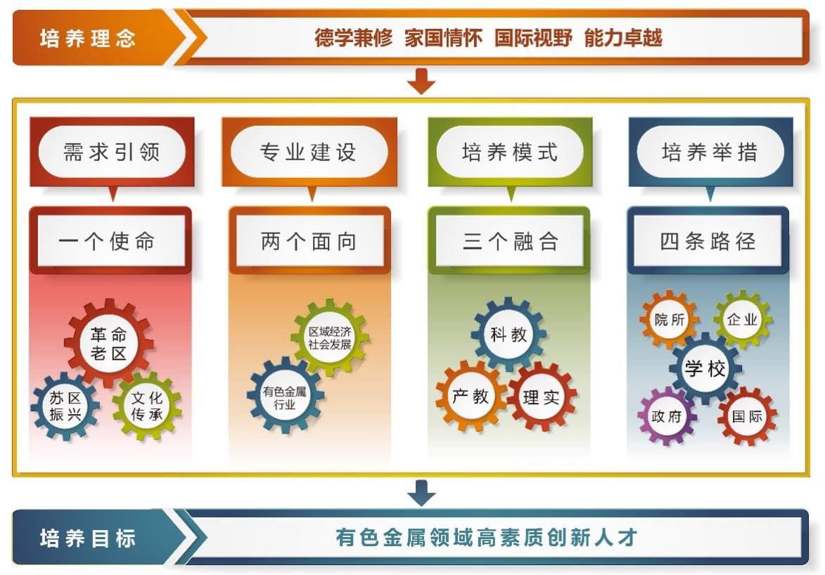 学校积极响应并深入实施高校学科专业的动态调整策略,通过多元化措施与全面发力,不仅强化了专业建设的规范化管理,还显著加大了专业动态调整的力度,从而实现了专业服务国家战略需求与区域经济发展的高度契合。一是围绕有色金属产业链人才培养加强顶层设计,突显学校办学特色。学校先后制定并发布了《颜射