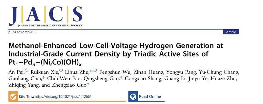 化学化工学院(功能晶态材料化学江西省重点实验室)朱丽华教授课题组在能源催化领域取得重要突破,成果在国际顶级期刊《Journal of the American Chemical Society》以“Methanol enhanced low-cell-voltage hydrogen generation at industrial-grade current density by triadic active sites of Pt1–Pdn–(Ni,Co)(OH)x”为题发表论文,颜射