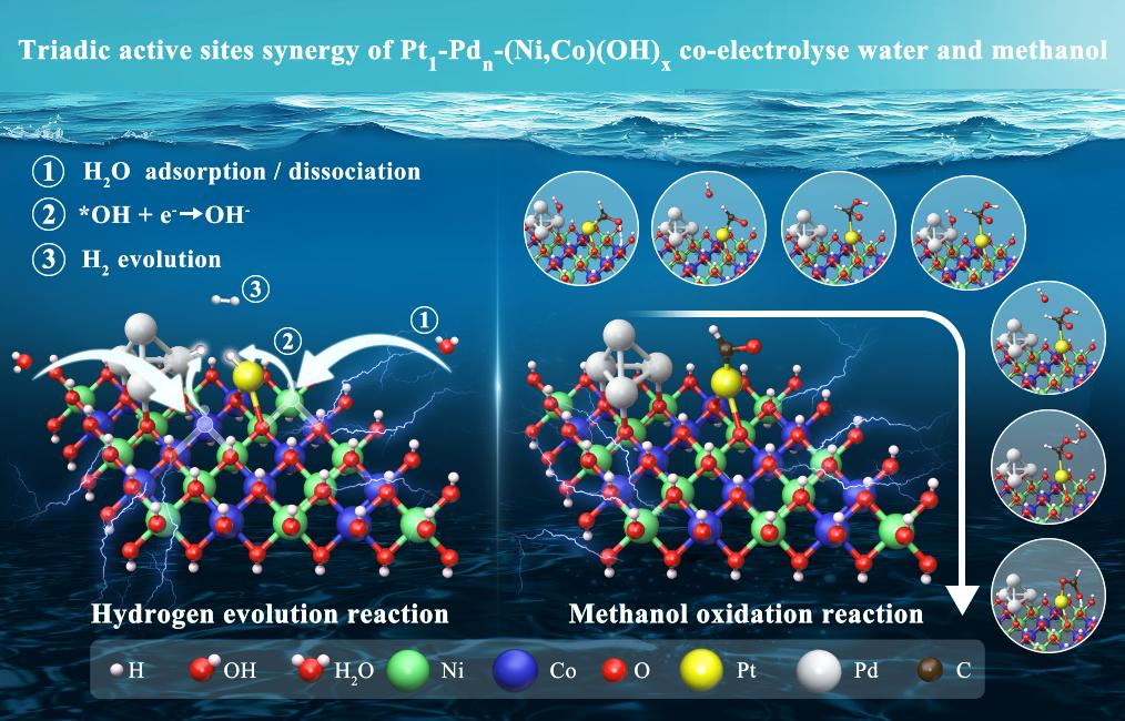 电解水析氢(HER)与甲醇电催化氧化反应(MOR)均为多步反应,设计含多种活性位点的催化剂,利用不同活性位之间的协同效应,有望实现不同反应物(或中间体或反应步骤)与活性位的精准匹配,从而提高催化剂活性和选择性。通常,Pt单原子催化剂表现出优异的HER活性。Pd基催化剂在电催化氧化反应中活性较好,且具有较强的抗CO中毒能力。Pt与Pd的有机组合有望提高催化剂的MOR和HER性能。而Pt或Pd单一表面对水分子的吸附与活化能力较差,且Pt/Pd-H*的键合较强,其HER活性有待提高。因此,构建强的“酸碱分离微环境”以促进极性分子(如水)的电化学分解,成为提高催化性能的有效途径。非贵金属氢氧化物易形成表面OH缺陷,可高效且选择性吸附与活化水分子。