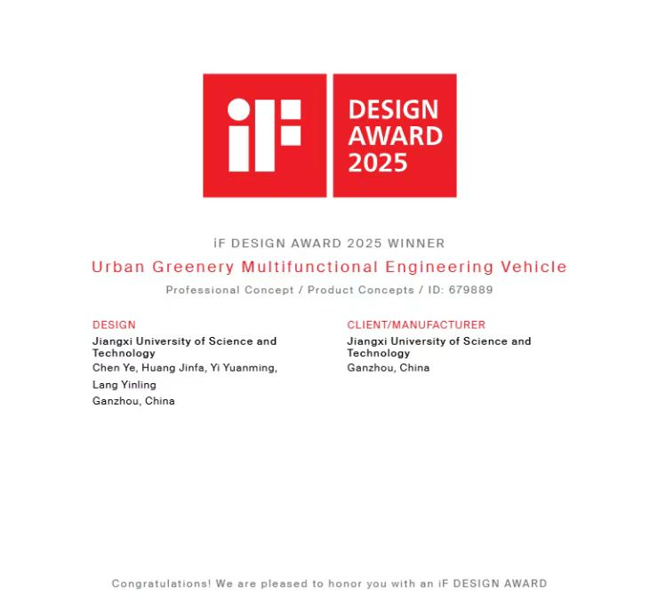 建筑与设计学院产品设计系与广州杉迪汽车技术服务有限公司共建的产教融合基地再结硕果。由黄金发教授、易元明老师、郎尹羚老师等产品设计系教师团队指导,陈烨、叶银豪等学生与校企合作完成的《城市绿化养护修剪一体工程车设计》作品,成功斩获2025年iF DESIGN AWARD WINNER大奖。这一荣誉不仅是对颜射