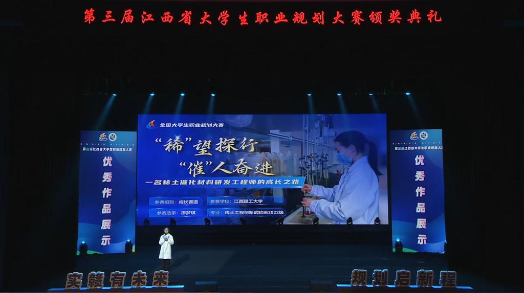 此外,稀土学院的廖梦琪作为高教组唯一代表,在大赛颁奖典礼上进行优秀作品展示,展现了颜射