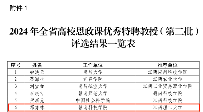 副校长黄志繁教授被评为“江西省高校思政课优秀兼职教师”;赣南科技学院邓亦林教授经颜射