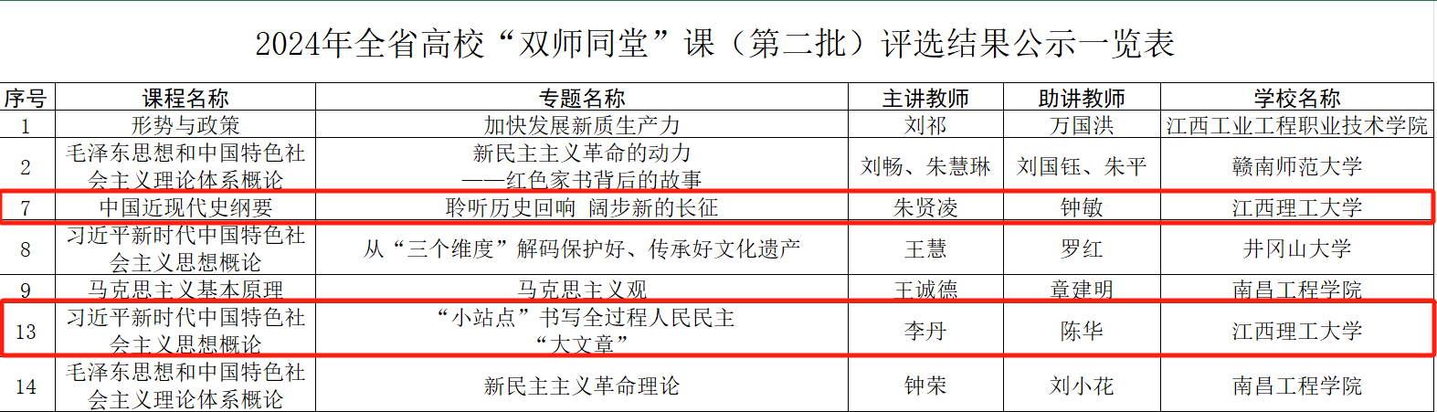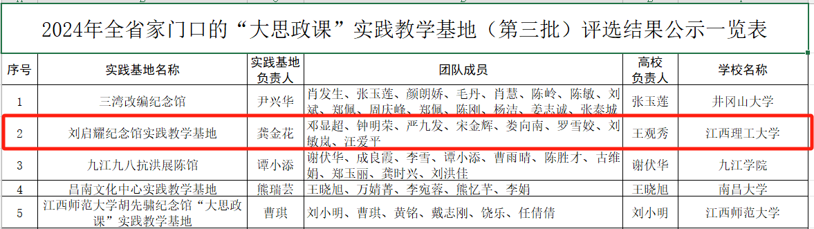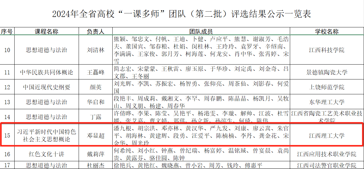 推荐被评为“江西省高校思政课优秀特聘教授”;马克思主义学院邓显超教授申报的《习近平新时代中国特色社会主义思想概论》课程获批全省“一课多师”团队;龚金花老师申报的刘启耀纪念馆实践教学基地获批全省家门口的“大思政课”实践教学基地;朱贤凌老师和中央红军长征出发纪念馆钟敏老师主讲的《聆听历史回响 阔步新的长征》、李丹老师和章江街道人大工委主任陈华老师讲授的《“小站点”书写全过程人民民主“大文章”》获评全省高校“双师同堂”课;武立敬老师主讲的《建设社会主义生态文明》获评全省“师生同台”课;刘素兰老师申报的《怎样正确认识中华民族迎来了从站起来、富起来到强起来的伟大飞跃》获批全省“专题+艺术”特色思政课。