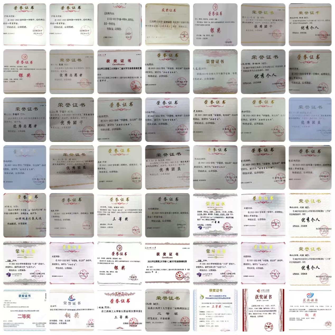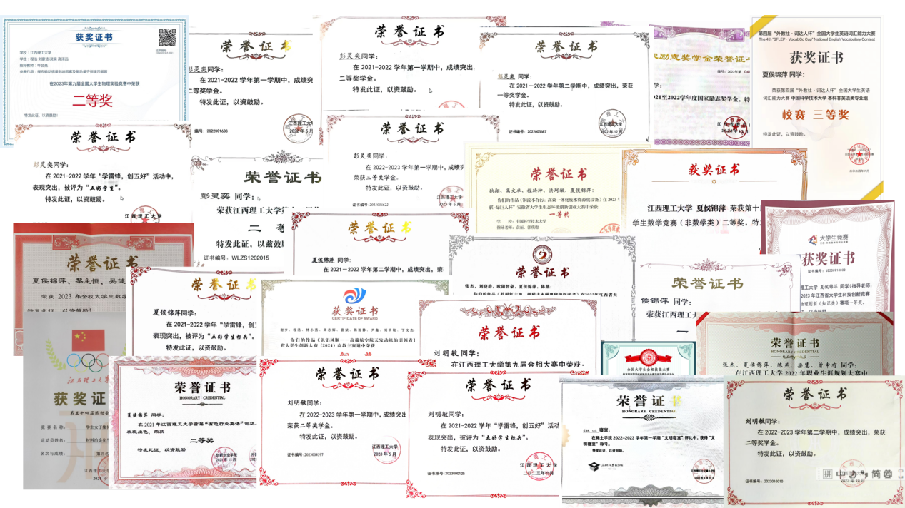 知识往往在运用中才能更好地巩固。在谈及为什么参与到科研与各类学科竞赛中,程浩表示:“作为一名工科的学生,我认识到科研、竞赛经历是非常重要的,因此在大一期间便主动加入到导师的科研团队中学习。虽然初期主要是做一些数据分析、文献阅读等基础工作,但通过学习我也逐步熟悉了科研的流程,锻炼了独立思考和解决问题的能力。”在江西省物理学术竞赛中,他负责了“沙地”与“摆动螺丝”两个课题,并独自开展实验,拿到了反方最高分,取得了省一等奖的好成绩,作品还在中国物理学术竞赛上获得一等奖。除此之外,他还参与到全国大学生节能减排社会实践与科技竞赛、江西省物理知识竞赛、2024年第一届江西省职业规划大赛、“建材杯”江西省中国国际大学生创新大赛、江西省金相技能大赛等各项竞赛中,并取得优异成绩。