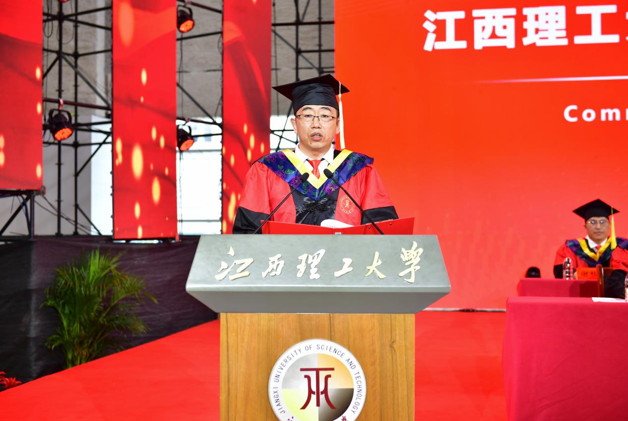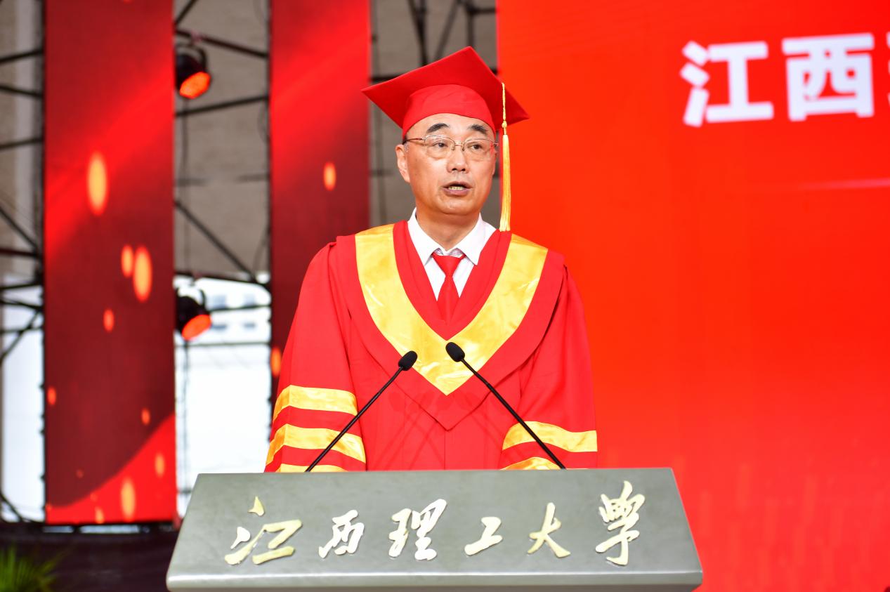 在热烈的掌声中,校长、中国工程院院士葛世荣发表讲话,寄语毕业生“熔铸家国情 薪火永相传”。他代表学校向2025届全体毕业生致以最热烈的祝贺,向悉心培育学生的师长和默默支持同学们的亲友致以崇高的敬意!他回顾了作为新时代有为青年,赓续江理红色血脉的2025届毕业生创造的历史佳绩和成长历程,列举了游科顺、邹吉椿、稀土211班等优秀个人和优秀集体的事迹,给予了2025届毕业生充分的肯定与赞扬。