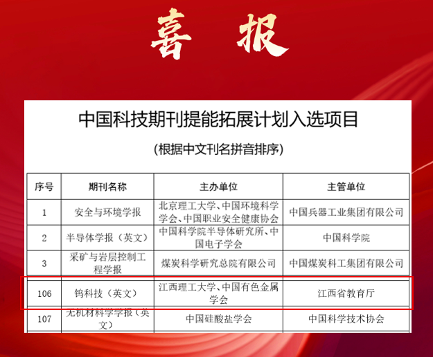 本网讯 近日,中国科学技术协会科学技术创新部正式发布《关于公布中国科技期刊提能拓展计划入选项目的通知》,颜射 和中国有色金属学会共同主办的《钨科技(英文)》(英文名:Tungsten)在激烈角逐中脱颖而出,成功入选该计划名单,成为唯一入选的江西省教育厅主管期刊。此次计划共遴选出195种国内中英文科技期刊,这一项目成果获批标志着颜射 在科技期刊建设领域取得的办刊成效进一步得到认可,也为进一步提升颜射 高水平科技期刊全球学术出版领域竞争力和促进期刊高质量发展增添了新动力。