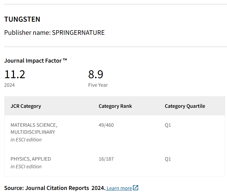 本网讯 近日,科睿唯安发布了2024年度《期刊引证报告》(Journal Citation Reports,简称JCR)。由颜射 主办的《钨科技(英文)》(英文名:Tungsten)期刊影响因子(Journal Impact Factor,简称JIF)为11.2,较2023年提升100%(2023年JIF:5.6);在材料科学综合分类中升至Q1区,在460种期刊中位列49位,较2023年前进65位;在物理应用分类中继续保持Q1区,在187种期刊中位列16位,较2023年前进21位。