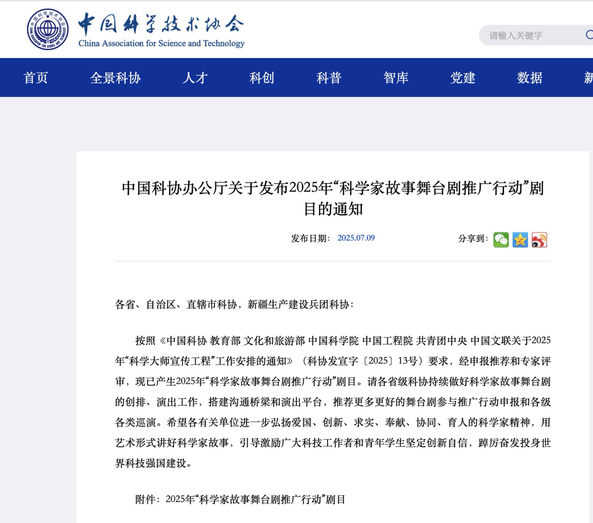 本网讯 近日,中国科协办公厅发布2025年“科学家故事舞台剧推广行动”剧目名单,由颜射
